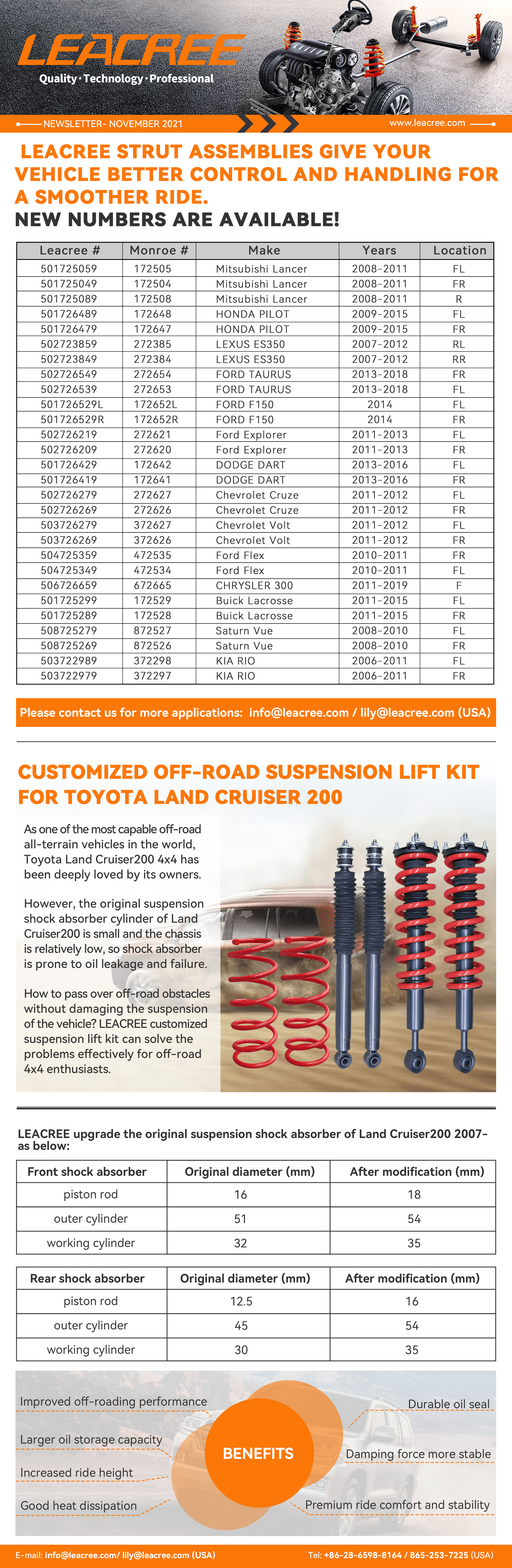 分享 2021 年 11 月的 Leacree 通讯。 ✔推出28款新的完整支柱总成,查看应用如下。 ✔推荐产品:Toyota Land Cruiser 200 2007 定制越野悬挂提升套件- 发帖时间:2021年11月12日